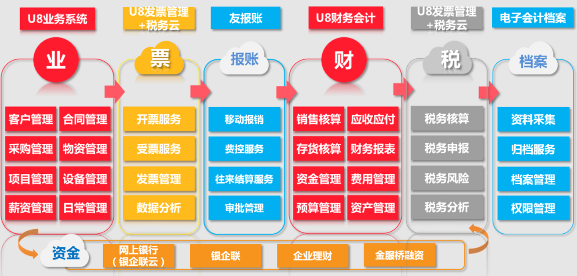 面對(duì)財(cái)稅新政要求,用友U8+全新的財(cái)稅一體化解決方案作為企業(yè)互聯(lián)網(wǎng)時(shí)代的產(chǎn)物,在原有財(cái)務(wù)業(yè)務(wù)管理的基礎(chǔ)之上,為企業(yè)提供費(fèi)用報(bào)銷、電子發(fā)票管理、電子會(huì)計(jì)檔案、銀企聯(lián)云支付、移動(dòng)應(yīng)用等,幫助企業(yè)快速跟上互聯(lián)網(wǎng)時(shí)代的步伐,提升企業(yè)競(jìng)爭(zhēng)力。